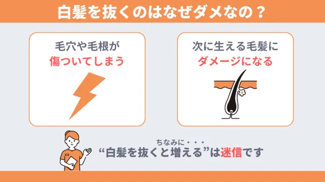 ちなみに、「白髪を抜くと増える」という情報を見ることがありますが、それは迷信です。増えることはありませんが、抜くと毛穴にダメージを与えてしまうため気を付けましょう。